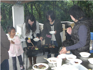 新しい先生(Chalice先生)の歓迎会もかねて五色台でBBQパーティをしました。あいにくの小雨でしたが、サイトには屋根もあり全員で楽しみました。たくあんの肉や新鮮な野菜、そしてKayokoさんのおでん、おむすび、ヒサコさんの柿・・・お腹いっぱいになりました。